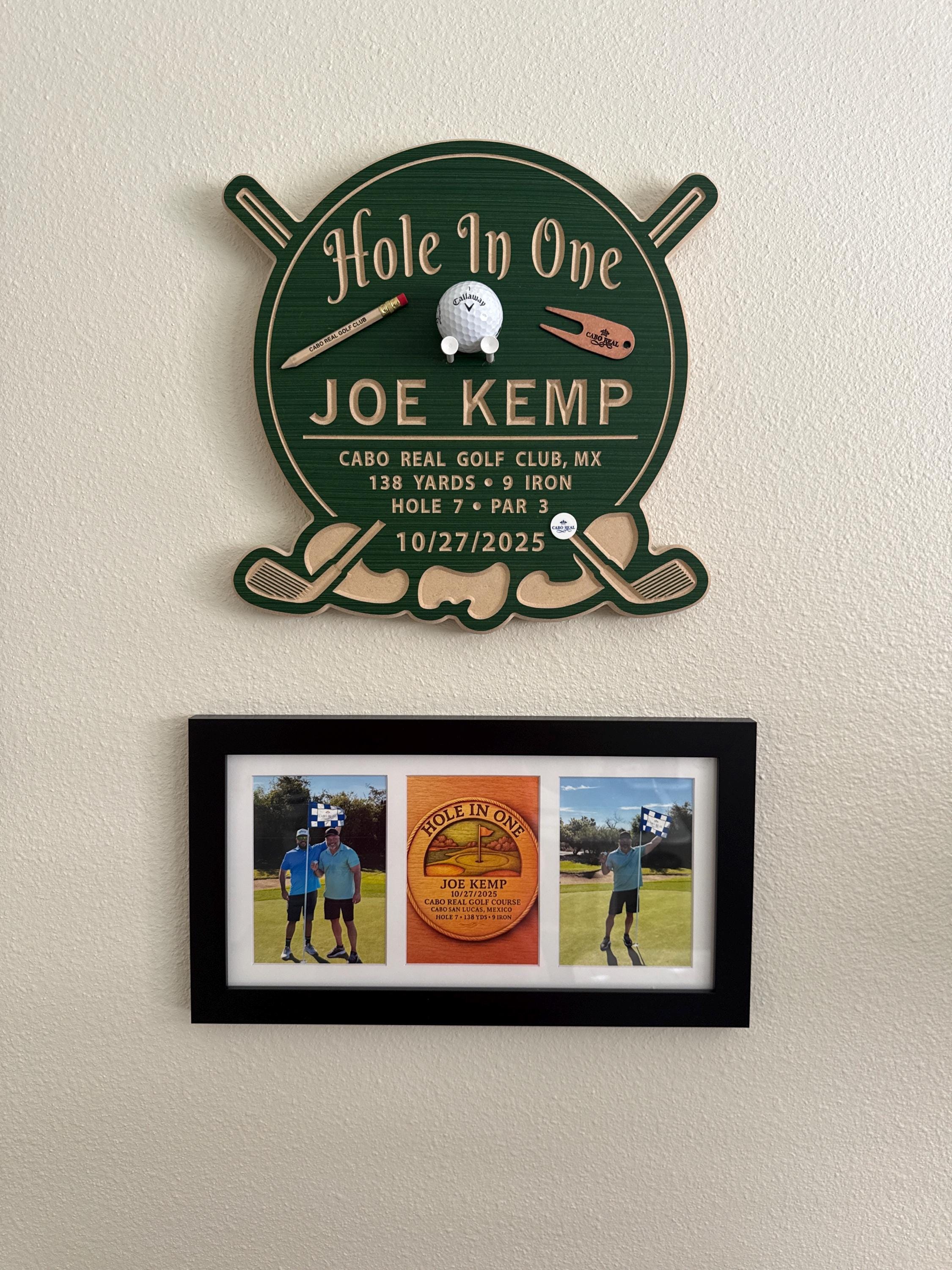 Show off you prized Hole In One ( or Double Eagle, Ect... ) golf ball, or create an amazing gift for your favorite golfer with one of these unique personalized carved wood wall displays. Get creative and personalize any or all of the text. Please be sure to check out our shop listings for other variations of this design if it’s not exactly what you’re looking for.